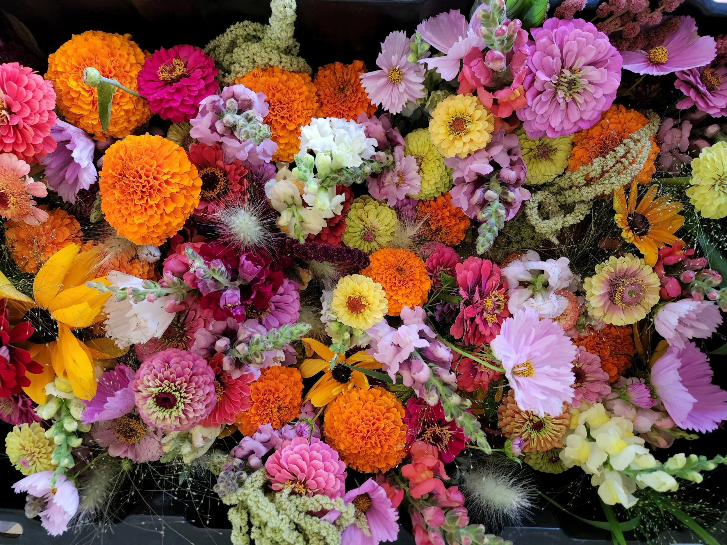 ICI à LA FERME, NOUS FaiSONS LA PRODUCTION D’UNE quaranTAINE DE VARIÉTÉS DE FLEURS. LEs SEMIS SONT PARTIS DIRECTEMENT ICI ET TRANSPLANTés à LA MAIN DANS LE CHAMPS LORSQUE LE SOL EST ASSEz CHAUD. CHAQUE FLEUR EST RÉCOLTÉE AVEC SOINS POUR VOUS OFFRIR UN PRODUIT D’UNE FRAîCHEUR IMBATTABLE!